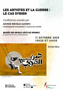 En collaboration avec la Direction du Musée des Beaux-Arts de Rennes, nous organisons une conférence le samedi 12 octobre 2020, conçue et animée par Mme Annick Neveux-Leclerc, Chargée de mission au département des Arts de l’Islam du Musée du Louvre et chargée de cours à l’École du Louvre. Dans un contexte de grande confusion, le drame que vit la Syrie depuis 2011 est devenu inaudible et difficilement compréhensible. Il n’est pas question ici de faire de géopolitique mais juste de se pencher sur un peuple meurtri : ses réponses quotidiennes à la pénurie et aux multiples agressions, l’émergence d’une société civile, l’incroyable besoin de communiquer et son corollaire : l’effervescence artistique…